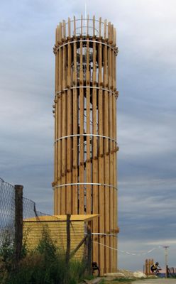 La tour Akátová věž s'élève à 17.7 mètres sur la colline Výhon, construite avec du béton, du métal et du bois d'acacia dans une forme cylindrique.