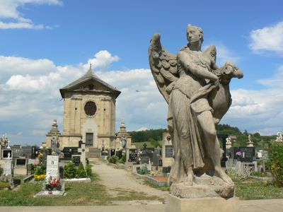 Le cimetière présente des agencements symétriques, des pierres tombales soigneusement disposées et des sculptures détaillées illustrant les principes de l'architecture baroque.