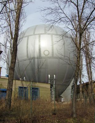 Le Libeňský plynojem est un réservoir de gaz sphérique à Libeň qui repose sur huit jambes d'acier ancrées à une base de béton circulaire. La structure mesure environ 20 mètres de diamètre et est revêtue d'une couche argentée.