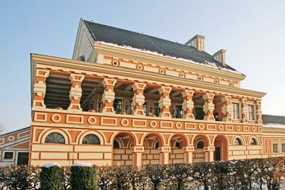 Le bâtiment rectangulaire aux éléments art déco présente de grands vitraux, des motifs géométriques et un grand escalier cérémoniel menant à la salle principale.