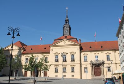 La Nová radnice est l'hôtel de ville situé à Dominikánské náměstí, avec des toits en tuiles rouges et des façades en pierre travaillée. Le bâtiment s'étend sur plusieurs étages avec des fenêtres régulièrement espacées et une tour centrale qui domine la place.