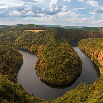 Le point de vue Vyhlídka Máj présente une formation rocheuse naturelle surplombant un méandre en fer à cheval de la rivière Vltava.