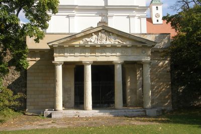 Le Caveau Familial de Liechtenstein est situé dans le complexe du Monastère de Vranov et contient des sculptures en pierre soigneusement travaillées d'anges entourant les urnes funéraires. La tombe est intégrée aux terrains du monastère et montre un mélange d'importance religieuse et familiale dans sa conception.