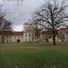 Le château présente une architecture symétrique avec des murs blancs, de grandes fenêtres rectangulaires et un toit mansardé typique du début du XIXe siècle.
