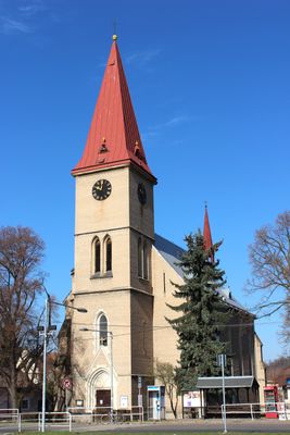 L'église Sainte-Catherine est un lieu de culte avec des éléments de style néo-gothique à Milovice. L'intérieur dispose de bancs en bois disposés en rangées et d'arcs en pierre qui façonnent l'espace où les visitants se déplacent et prient.