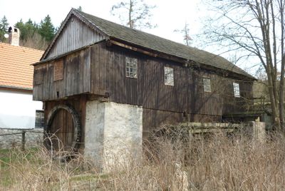 La scierie Vodní pila Penikov présente une structure en bois avec un rez-de-chaussée intégré dans la digue de l'étang et une scie verticale.