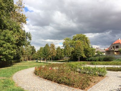Le Čakovický zámecký park est une propriété de sept hectares dotée de sentiers organisés selon une disposition géométrique et d'un bassin situé dans sa partie nord. Des arbres matures de diverses espèces façonnent le paysage et définissent le caractère global du parc.