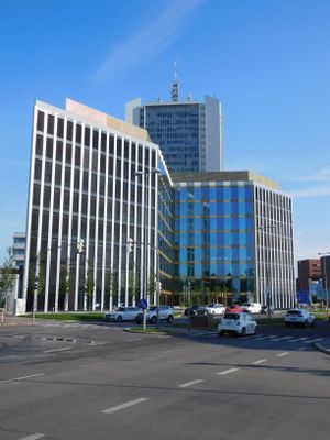Le complexe sert d'immeuble de bureaux avec plusieurs étages d'espace de travail, situé dans un quartier d'affaires en développement de Prague.