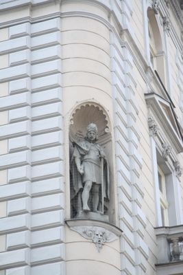 Socha Jiřího z Poděbrad na rohu domu Nitranská 988/19, statue in Vinohrady, Czech Republic