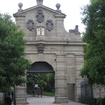 La Leopoldova brána est une porte baroque à Vyšehrad présentant une double entrée avec une voûte centrale contenant deux meurtrières et des sculptures ornementales de lions et de blasons. La structure est soutenue par d'épais murs de pierre et fonctionne comme un passage clé du complexe fortifié historique.