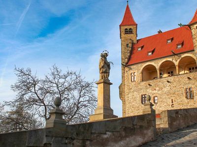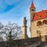 La statue en bronze de Jean Népomucène se dresse près de l'entrée du Château de Bouzov, représentant un prêtre tenant un crucifix entouré de cinq étoiles.