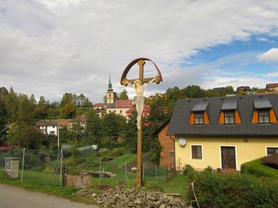 Dřevěný kříž v Bystřeci u hostince, pamětní kříž v obci Bystřec, okres Ústí nad Orlicí