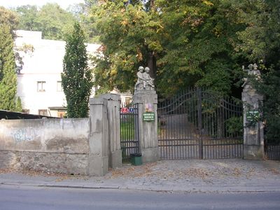 Main entrance of the Malešice botanical garden, brána areálu Jiráskovy vily v Praze 9-Malešicích