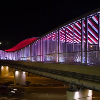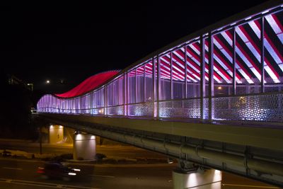 La Passerelle Helyx traverse la rue SW 13 avec deux vagues métalliques entrecroisées qui créent un motif architectural en spirale éclairé par des LED.