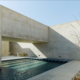 Une falaise naturelle de grès monte dans la piscine principale, créant une connexion transparente entre les structures bâties et la nature environnante. Ce design inhabituel fait de la piscine un endroit où l'architecture et le paysage se fondent ensemble.