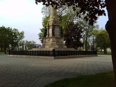 Le parc Hackley présente des monuments dédiés aux soldats de la Guerre Civile et des bâtiments en granit rose avec des ornements en grès brun.