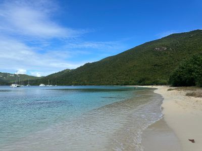 Le littoral courbé de Brewers Bay s'étend le long des rivages de sable blanc avec des palmiers et des raisins de mer offrant des zones ombragées.