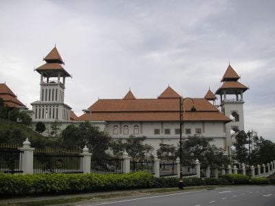 Istana Melawati présente trois hautes tours qui marquent son design architectural avec des toits à trois niveaux ornés d'éléments décoratifs en argile.