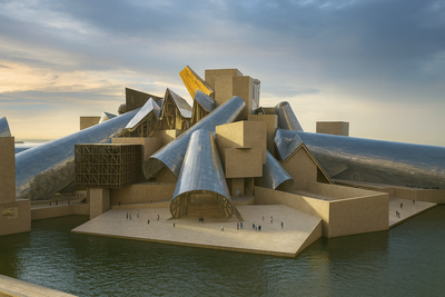 La conception intègre des éléments architecturaux traditionnels du Moyen-Orient tels que des tours à vent et des cours pour réduire la consommation d'énergie tout en présentant le style déconstructiviste caractéristique de Gehry avec des formes curvilignes inspirées du paysage désertique et de l'environnement côtier.