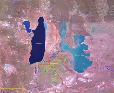 Le lac Colhué Huapi couvre 810 kilomètres carrés avec une profondeur de 2 mètres et présente des îles argileuses rougeâtres sur sa surface.