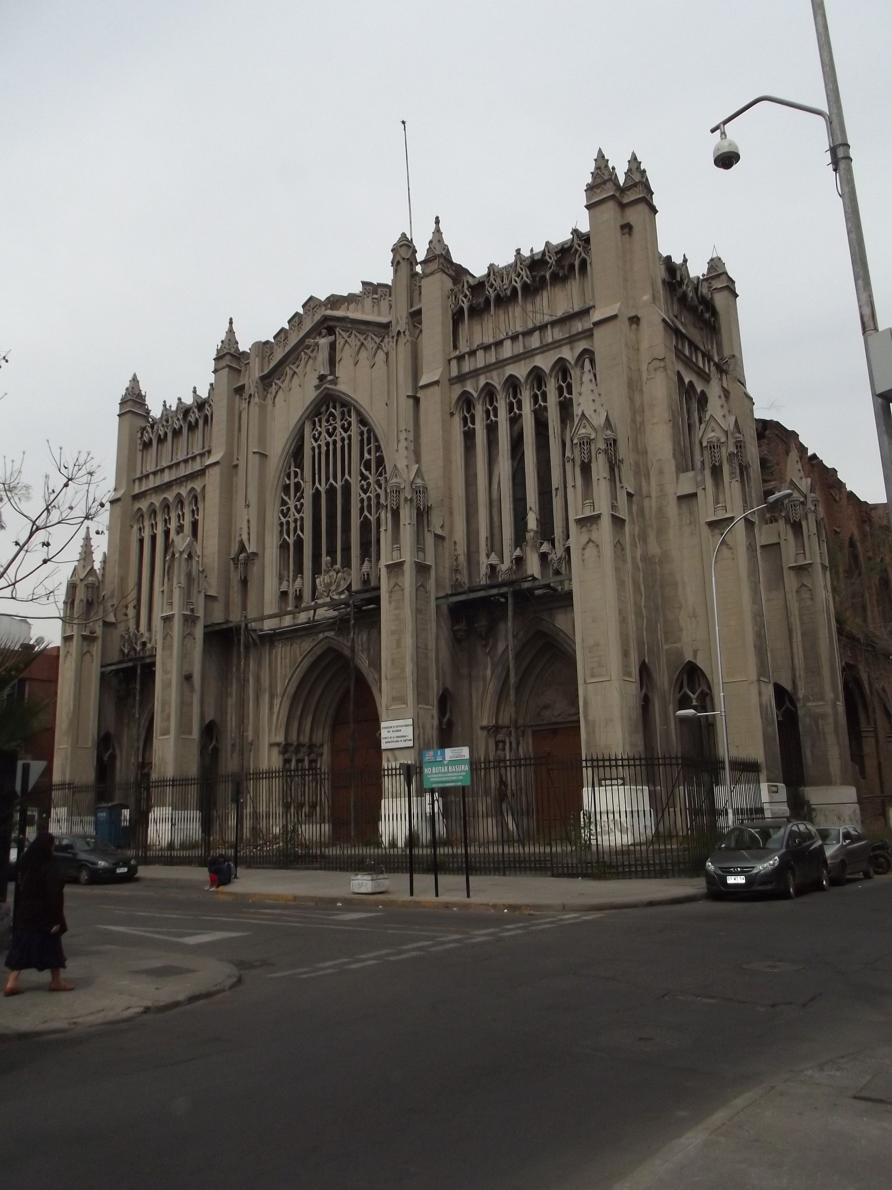 La Basilique du Salvador se dresse à l'intersection des rues Huérfanos et Almirante Barroso, présentant une architecture néogothique avec des arcs pointus et des voûtes.