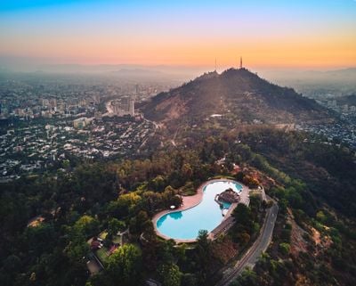 Depuis les bassins d'eau, les nageurs peuvent voir la ligne d'horizon de Santiago s'étendre à travers le paysage pendant qu'ils se baignent ou se détendent. Cette vue transforme une simple baignade en quelque chose de plus mémorable en reliant l'espace aquatique à la ville au-delà.