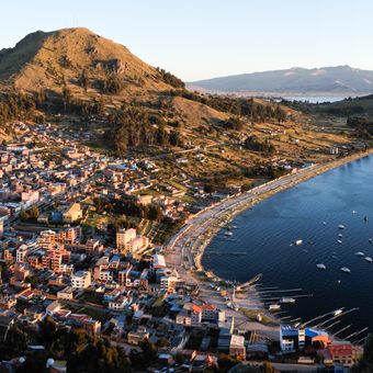 Copacabana est une ville sur la rive occidentale du lac Titicaca en Bolivie, située à environ 3.840 mètres d'altitude. La basilique blanche se dresse au centre, tandis que les pics environnants encadrent la ville de tous côtés.