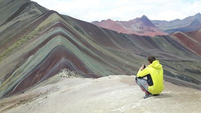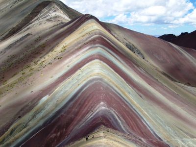 Des couches minérales aux teintes rouges, jaunes, violettes et vertes s'étendent sur les pentes de ce sommet andin à 5200 m d'altitude, formant des bandes parallèles. Les formations géologiques apparaissent plus clairement sur les flancs érodés, où différentes strates sédimentaires ont été exposées par des processus naturels et créent un motif rayé distinctif.