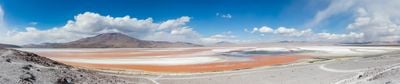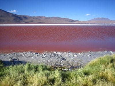 Le Laguna Colorada est un lac salé situé dans la Réserve nationale de faune andine Eduardo Abaroa près d'Uyuni à environ 4.270 mètres d'altitude. L'eau est parsemée d'îles blanches de minéraux et teintée de rouge par des algues qui prospèrent dans ces conditions d'haute altitude.
