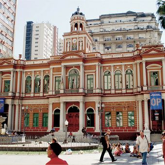 Le Paço Municipal est un palais d'architecture éclectique au centre-ville de Porto Alegre, avec des statues allégoriques de la Liberté, l'Histoire, la Science et l'Agriculture sur sa façade. L'édifice suit une structure tripartite avec des ordres classiques de colonnes qui incarnent différents concepts de pouvoir et de justice.