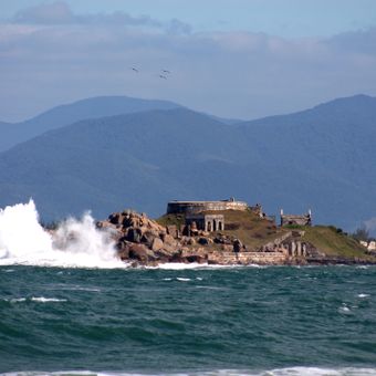 La forteresse se dresse sur l'île d'Araçatuba à l'entrée sud du canal de Santa Catarina, avec des murs en pierre et des batteries d'artillerie.