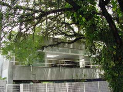 Casa Gerassi est une maison moderniste à Butantã avec un étage principal suspendu soutenu par quatre piliers en béton. Le niveau inférieur reste ouvert et ne contient que l'escalier et une piscine.
