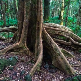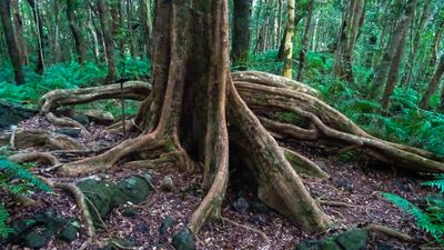 Les systèmes racinaires de la forêt se sont adaptés pour croître dans des couches minimales d'humus sur le sol volcanique.