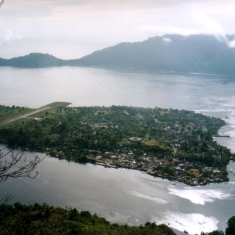 Banda Neira est un établissement historique sur l'île du même nom dans les îles Banda, dominé par le mont Papenberg qui s'élève au centre. Les bâtiments s'étendent sur les pentes et les plaines autour de ce pic, mélangeant les structures de l'époque coloniale avec les maisons et les entrepôts locaux.