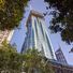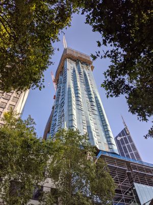 Le bâtiment du 380 Lonsdale Street atteint une hauteur de 221 mètres avec 67 étages, présentant une façade en verre et des éléments architecturaux courbes.