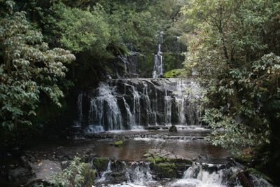 Purakaunui Falls est une cascade dans Les Catlins qui dégringole en trois étapes distinctes sur environ 20 mètres. L'eau tombe à travers une forêt native dense, formant une série de bassins qui recueillent l'eau entre chaque cascade.