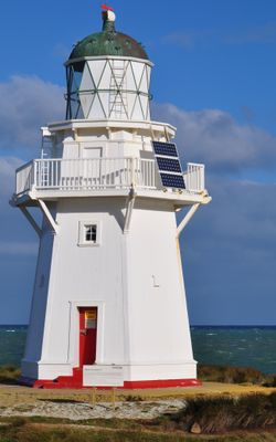 Cette structure représente l'un des deux derniers phares en bois construits en Nouvelle-Zélande, avec une conception hexagonale et un balcon.