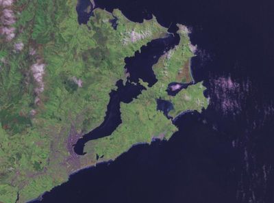 Hoopers Inlet, Baie côtière dans la Péninsule d'Otago, Nouvelle-Zélande.