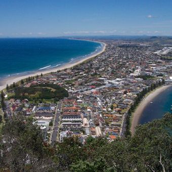Tauranga est une ville située sur la côte nord de l'île du Nord de la Nouvelle-Zélande, bâtie autour d'un port abrité encadré par des collines volcaniques et de longues plages de sable. La zone urbaine longe le littoral et s'étend dans des vallées douces, avec des quartiers résidentiels qui grimpent sur les pentes offrant des vues sur l'eau.