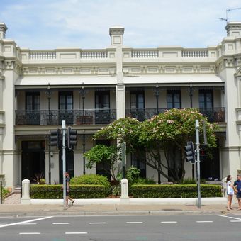 Le bâtiment victorien de style italien présente deux maisons connectées avec des parapets décoratifs et des ferronneries détaillées sur plusieurs vérandas.