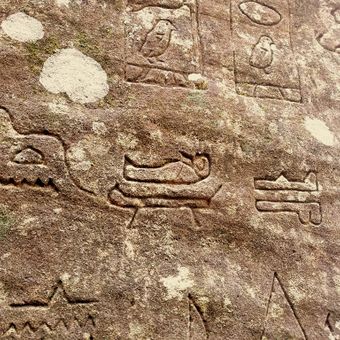Les parois en grès présentent 300 gravures de style égyptien illustrant des bateaux, des animaux, des figures humaines et des motifs géométriques.