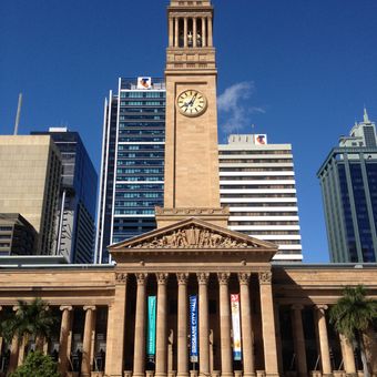 L'Hôtel de Ville de Brisbane de trois étages présente une architecture Renaissance italienne avec une tour horloge de 91 mètres et un auditorium.