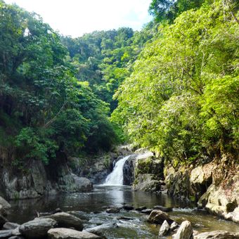 Les Crystal Cascades forment une succession de chutes d'eau et de bassins naturels le long du ruisseau Freshwater Creek près de Cairns. L'eau s'écoule à travers une végétation tropicale dense et crée plusieurs zones de baignade où le ruisseau se déverse sur les roches à différentes hauteurs.