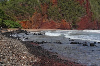 Le sable rouge et noir de la plage Kaihalulu provient des dépôts volcaniques riches en fer des falaises escarpées le long de la côte de Hana.