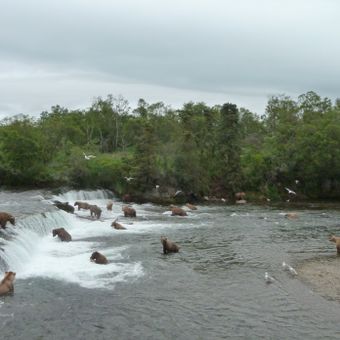La cascade sert de point d'alimentation naturel où jusqu'à 25 ours bruns se rassemblent en juillet pour attraper les saumons.