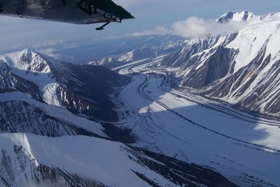 La branche ouest du glacier descend par la cascade de glace Traleika, chutant depuis les 4.600 mètres du bassin Thayer.