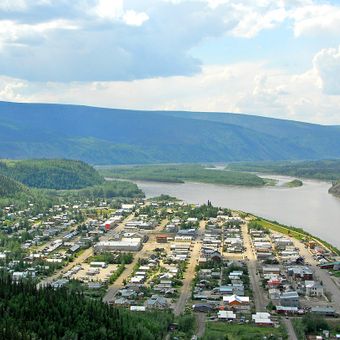 Située au confluent des rivières Yukon et Klondike, Dawson City présente des bâtiments en bois et des rues en gravier dans son centre-ville.