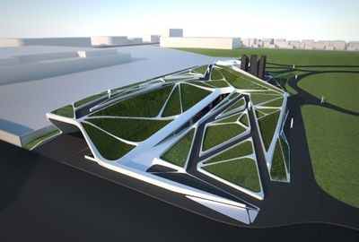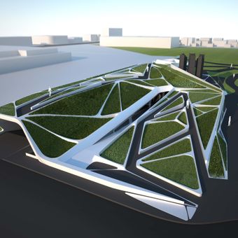 La conception souterraine du bâtiment intègre six piliers de granit noir représentant les cheminées des crématoires et honorant six millions de victimes juives.