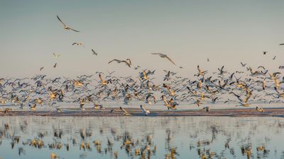 La forte salinité de l'eau crée des bassins salés caractéristiques tout en attirant de nombreuses espèces d'oiseaux dans cet oasis désertique sous le niveau de la mer.