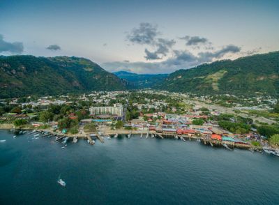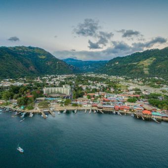 Panajachel se trouve sur la rive nord du lac Atitlán à 1.597 mètres d'altitude, entourée de trois volcans et d'une végétation dense. La ville s'étend le long du front de mer avec des zones résidentielles, des marchés et des installations touristiques dans une large vallée.